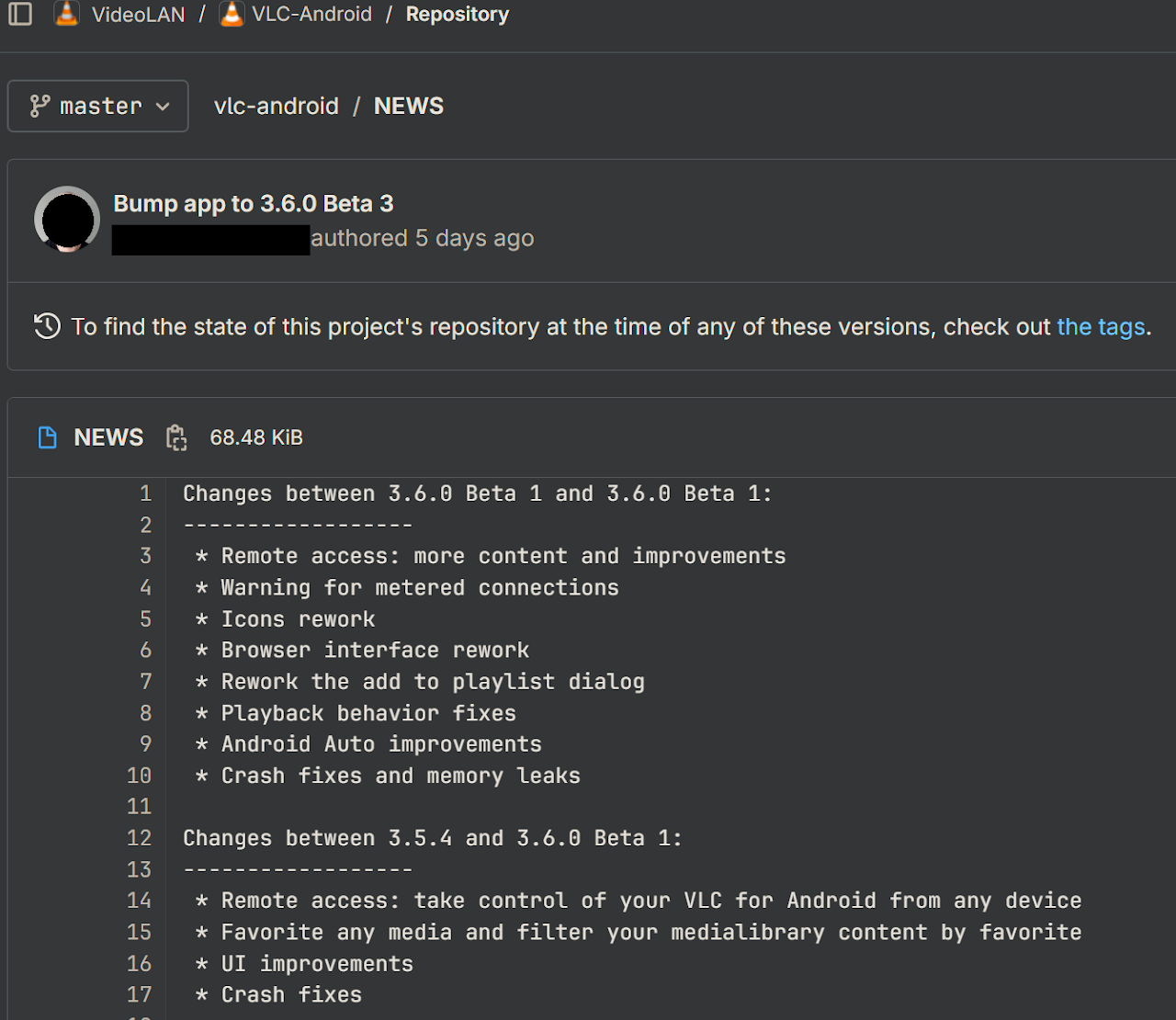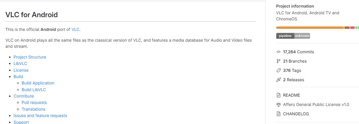 In visiting its open-source repository, VLC for Android is well-documented and actively maintained with over 17K commits and 376 tags. By reviewing its README, we learn how the project is structured, its architecture, and how to access its bug tracker and IRC channel.