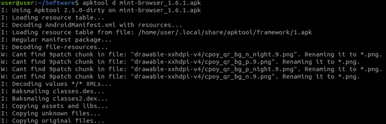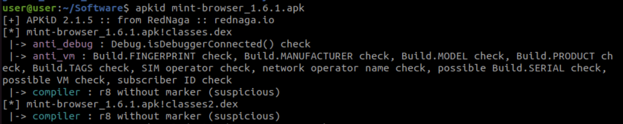 APKiD is like PEiD, but for APK files, outputting what compilers, packers, obfuscators, and security mechanisms are used by the APK. This play illuminates APK design elements and potential issues that may need to be addressed throughout the security research process. When we run APKiD against the Mint Browser v1.6.1 APK, its output reveals that the application consists of anti-debugging and anti-virtual machine (VM) checks that may prevent dynamic analysis and virtualization of the software. It was compiled with R8, a modern code shrinker and optimizer developed by Google that is highly efficient at reducing app size, improving performance, and obfuscating code to some extent. However, APKiD didn’t find the typical markers it expects to see for the R8 compiler and annotated the result as suspicious. It’s also worth noting that the output of APKiD did not indicate the APK’s use of other obfuscators and packers which can prevent or hinder the static analysis process, including reverse engineering.