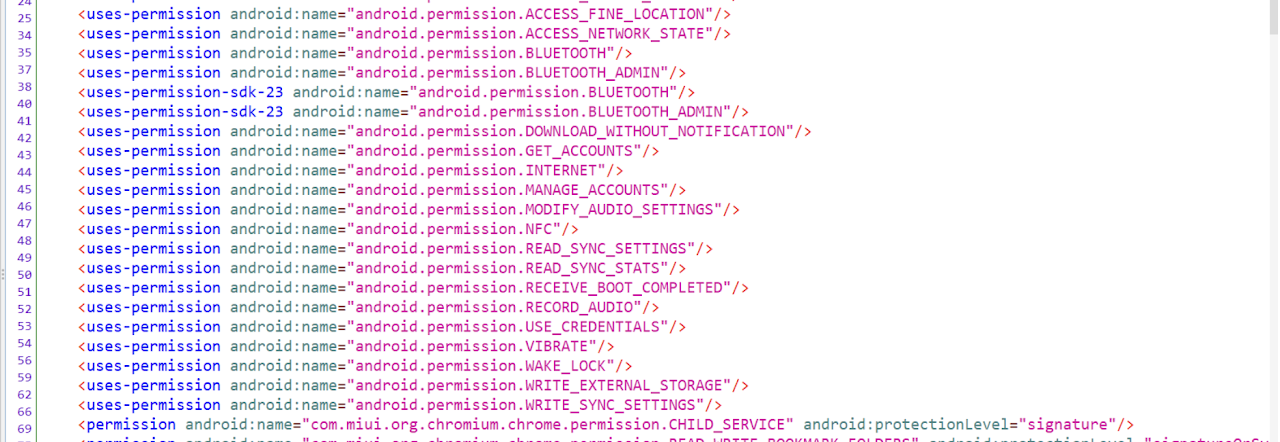 When we decompile the Mint Browser APK using JADX, a Dex-to-Java decompiler that comes equipped with automatic decoding and deobfuscation features, we can view the decoded AndroidManifest.xml file and the generated Java code that aims to be similar to the original source code that the developer might have written for the Android application. The AndroidManifest.xml reveals that the APK utilizes 35 permissions and consists of 18 Activities, 9 Services, 6 Receivers, and 8 Providers, many of which are exported and can be launched by other apps on the device.